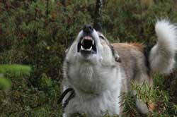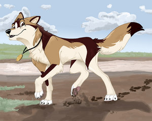 ^3. Внешность. - очень крупный, сильный пес, с широкой грудной клеткой и сильными лапами, в холке около 85-87 см, шерсть пушистая, серо-коричневой масти, глаза янтарные, внимательные, стоячие уши, пушистый хвост, крепкие, на удивление ровные клыки, множество шрамов по всему телу, отгрызен кончик правого уха, на задней левой лапе не хватает трех пальцев, отчего след остается неровным и очень приметным.